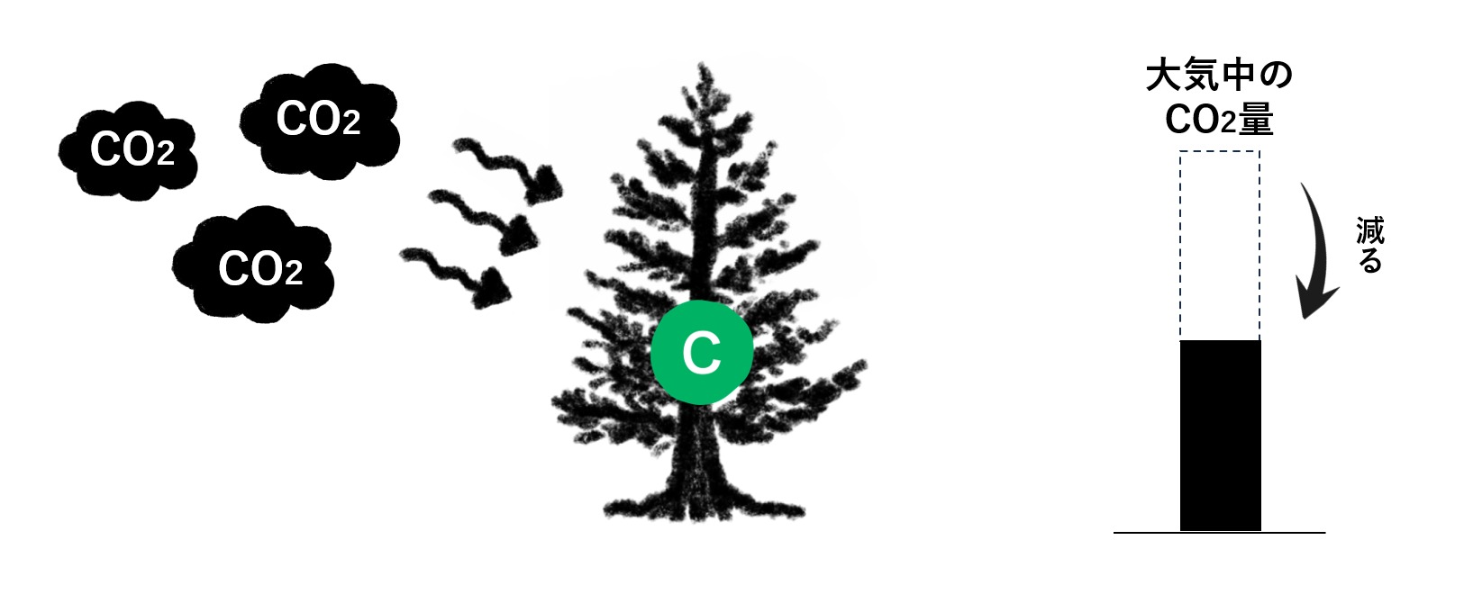 木を例に説明しましょう。木は光合成で大気中の二酸化炭素(CO2)を吸収し、有機物に変換して体に蓄積します。これを炭素固定といいます。